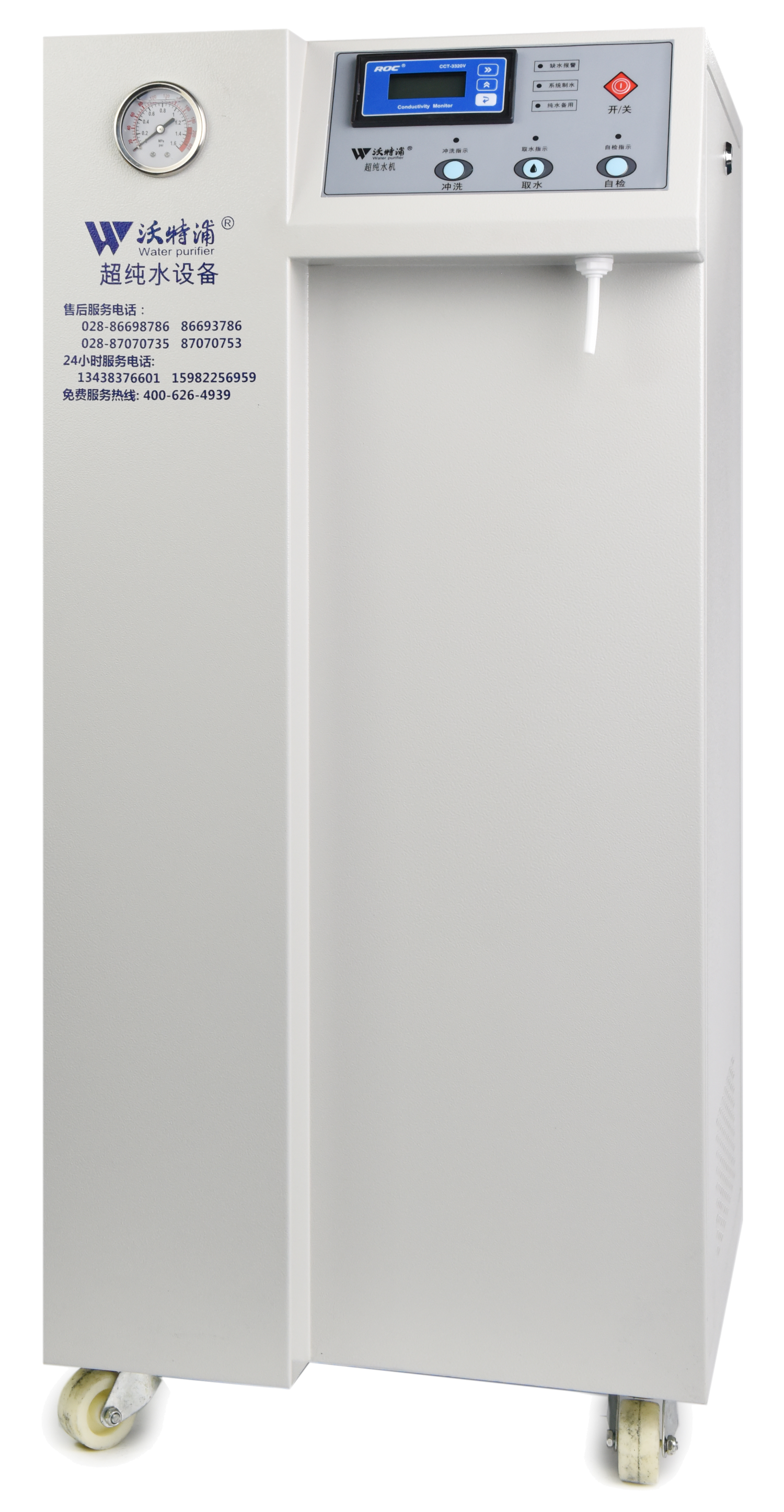 水質監測:具備RO水電導率、EDI去離子水電阻率、UP超純水電阻率(電阻率儀電阻池常數0.01cm-1,溫度自動補償)、總有機碳量(TOC)在線檢測顯示功能;